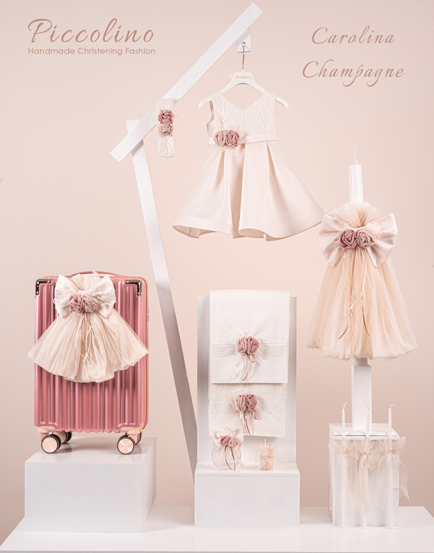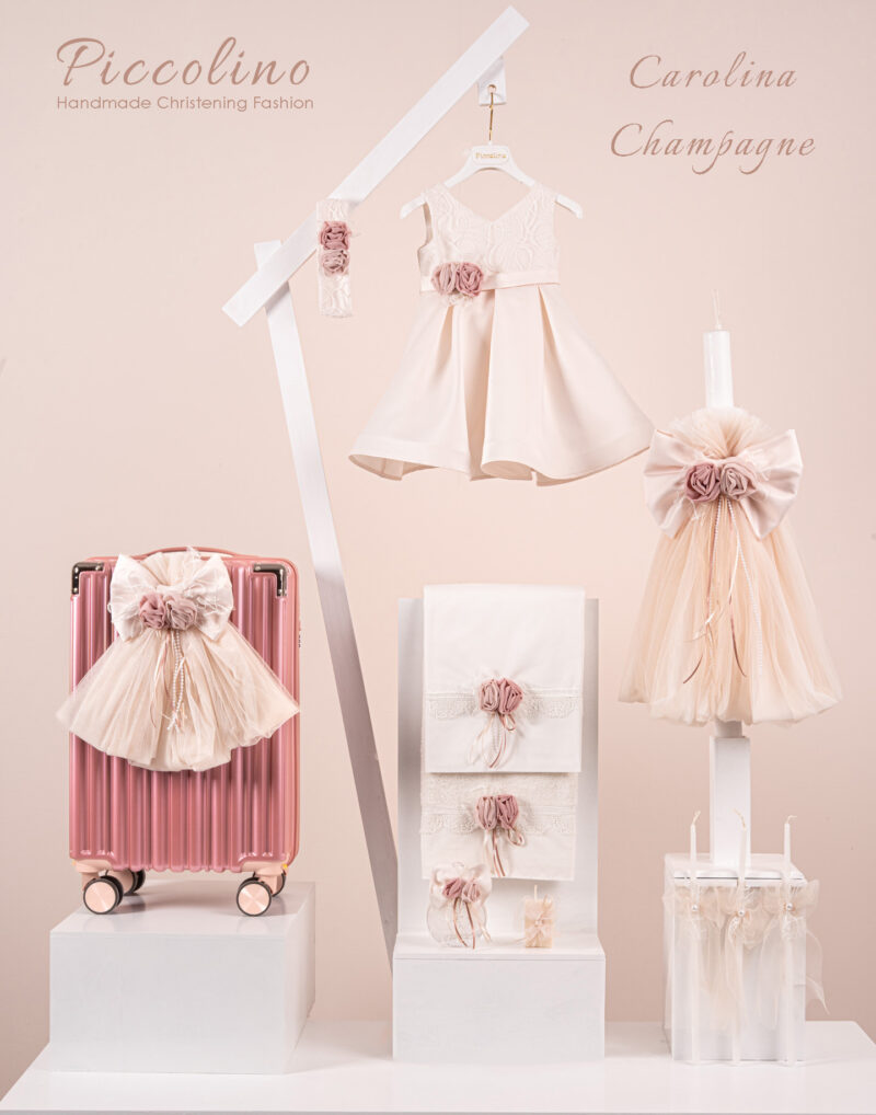 Βαπτιστικό πακέτο Piccolino Carolina champagne περιλαμβάνει φόρεμα ,σετ λαδόπανα, λαμπάδα, λαδοσετ και στολισμένη βαλίτσα puce