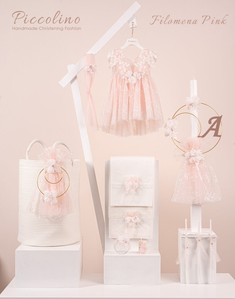 Βαπτιστικό πακέτο Piccolino Filomena pink περιλαμβάνει φόρεμα ,σετ λαδόπανα, λαμπάδα, λαδοσετ και στολισμένο barel off white