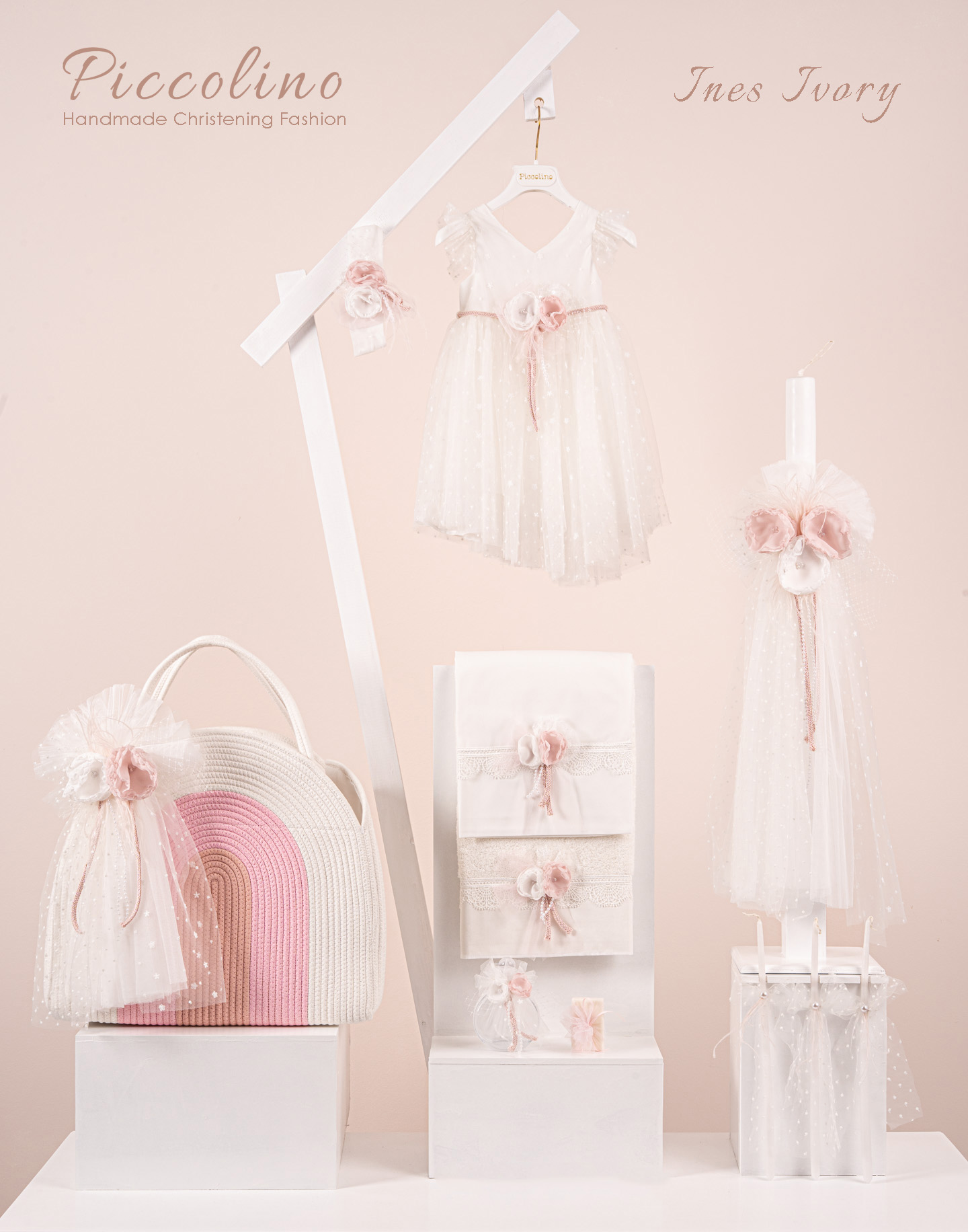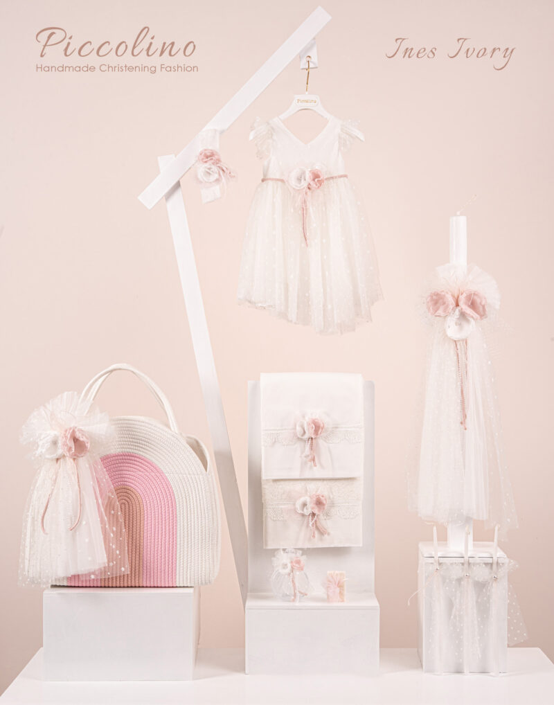 Βαπτιστικό πακέτο Piccolino Ines ivory περιλαμβάνει φόρεμα ,σετ λαδόπανα, λαμπάδα, λαδοσετ και στολισμένη τσάντα ropes