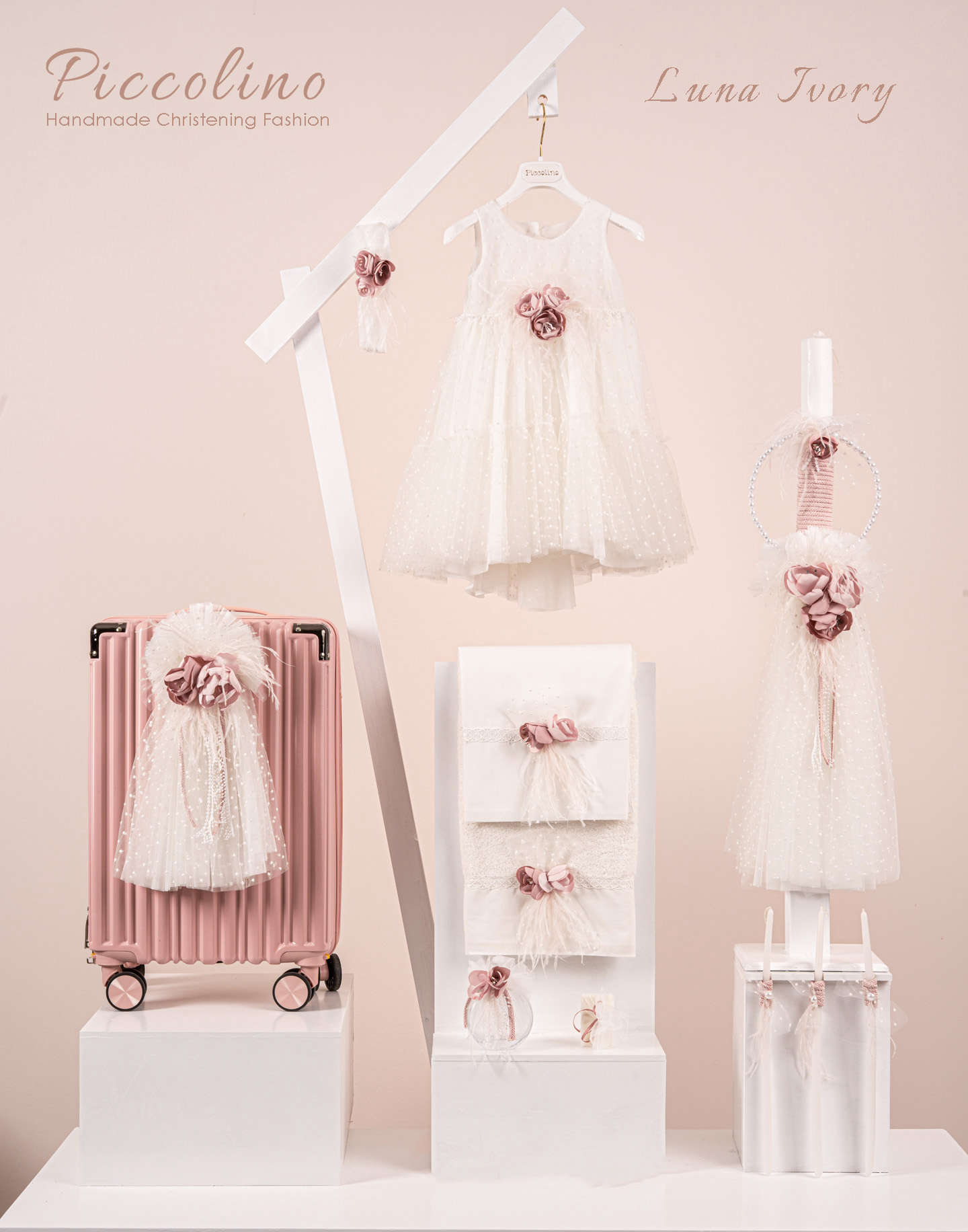 Βαπτιστικό πακέτο Piccolino Luna ivory περιλαμβάνει φόρεμα ,σετ λαδόπανα, λαμπάδα, λαδοσετ και στολισμένη βαλίτσα pink