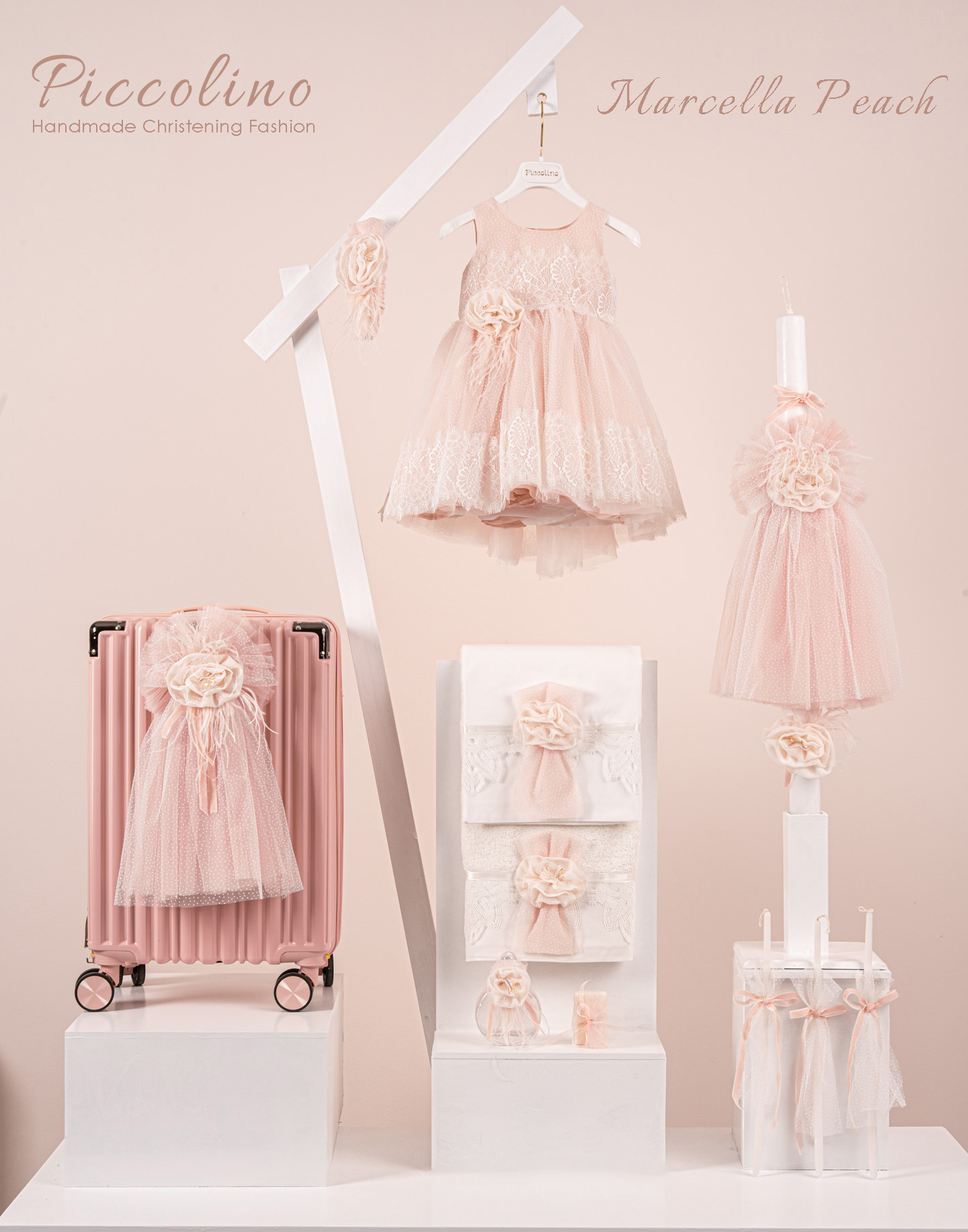 Βαπτιστικό πακέτο Piccolino Marcella peach περιλαμβάνει φόρεμα ,σετ λαδόπανα, λαμπάδα, λαδοσετ και στολισμένη βαλίτσα pink