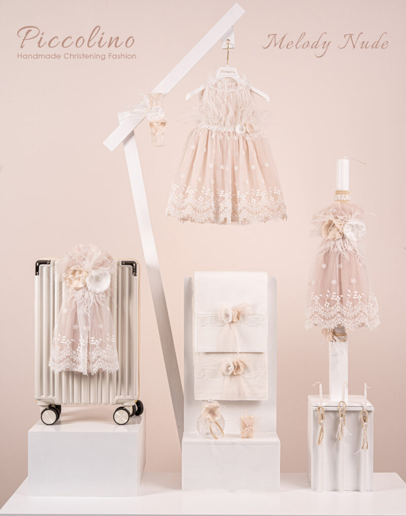Βαπτιστικό πακέτο Piccolino Melody nude περιλαμβάνει φόρεμα ,σετ λαδόπανα, λαμπάδα, λαδοσετ και στολισμένη βαλίτσα cream