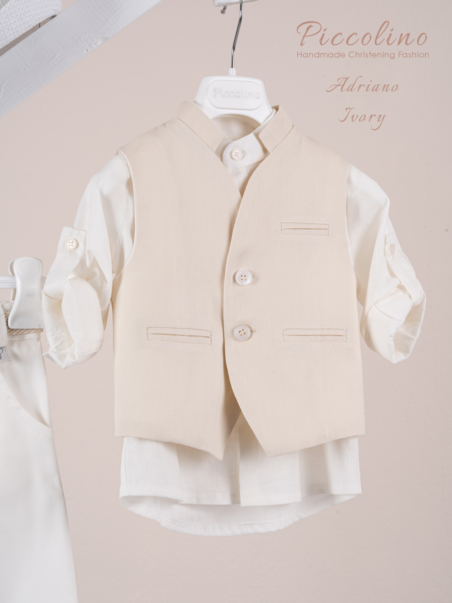 Βαπτιστικό κοστούμι Piccolino Adriano σε χρώμα Ivory. Περιλαμβάνει βαμβακερό καμπυλόγραμμο γιλέκο, πουκάμισο λινό με μάο γιακά, παντελόνι βαμβακερό σε χρώμα Ivory, ζώνη με double D δέσιμο και καπέλο με φάσα. Διαθέσιμο σε 4 μεγέθη 6-12, 12-18, 18-24, 24-36(εξτρά χρέωση)
