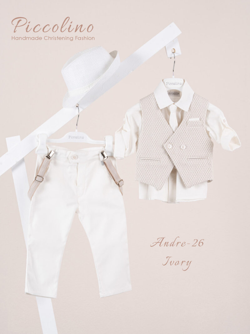 Βαπτιστικό κοστούμι Piccolino Andre-26 σε χρώμα Ivory. Περιλαμβάνει γιλέκο δίκουμπο σταυρωτό με μύτη, πουκάμισο λινό, παντελόνι βαμβακερό σε χρώμα Ivory, γραβάτα, τιράντες και καπέλο με φάσα. Διαθέσιμο σε 4 μεγέθη 6-12, 12-18, 18-24, 24-36(εξτρά χρέωση)