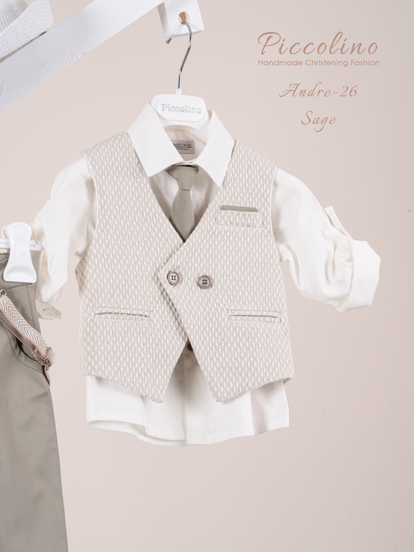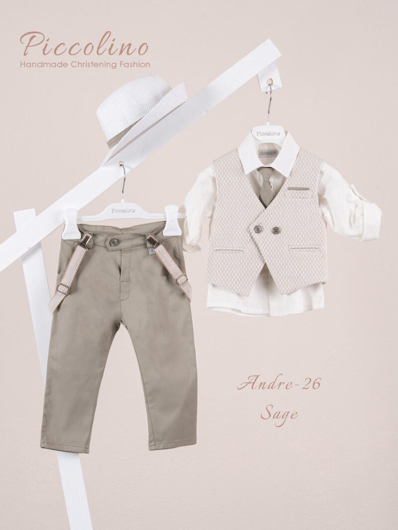 Βαπτιστικό κοστούμι Piccolino Andre-26 σε χρώμα Sage. Περιλαμβάνει γιλέκο δίκουμπο σταυρωτό με μύτη, πουκάμισο λινό, παντελόνι βαμβακερό σε χρώμα Sage, γραβάτα, τιράντες και καπέλο με φάσα. Διαθέσιμο σε 4 μεγέθη 6-12, 12-18, 18-24, 24-36(εξτρά χρέωση)