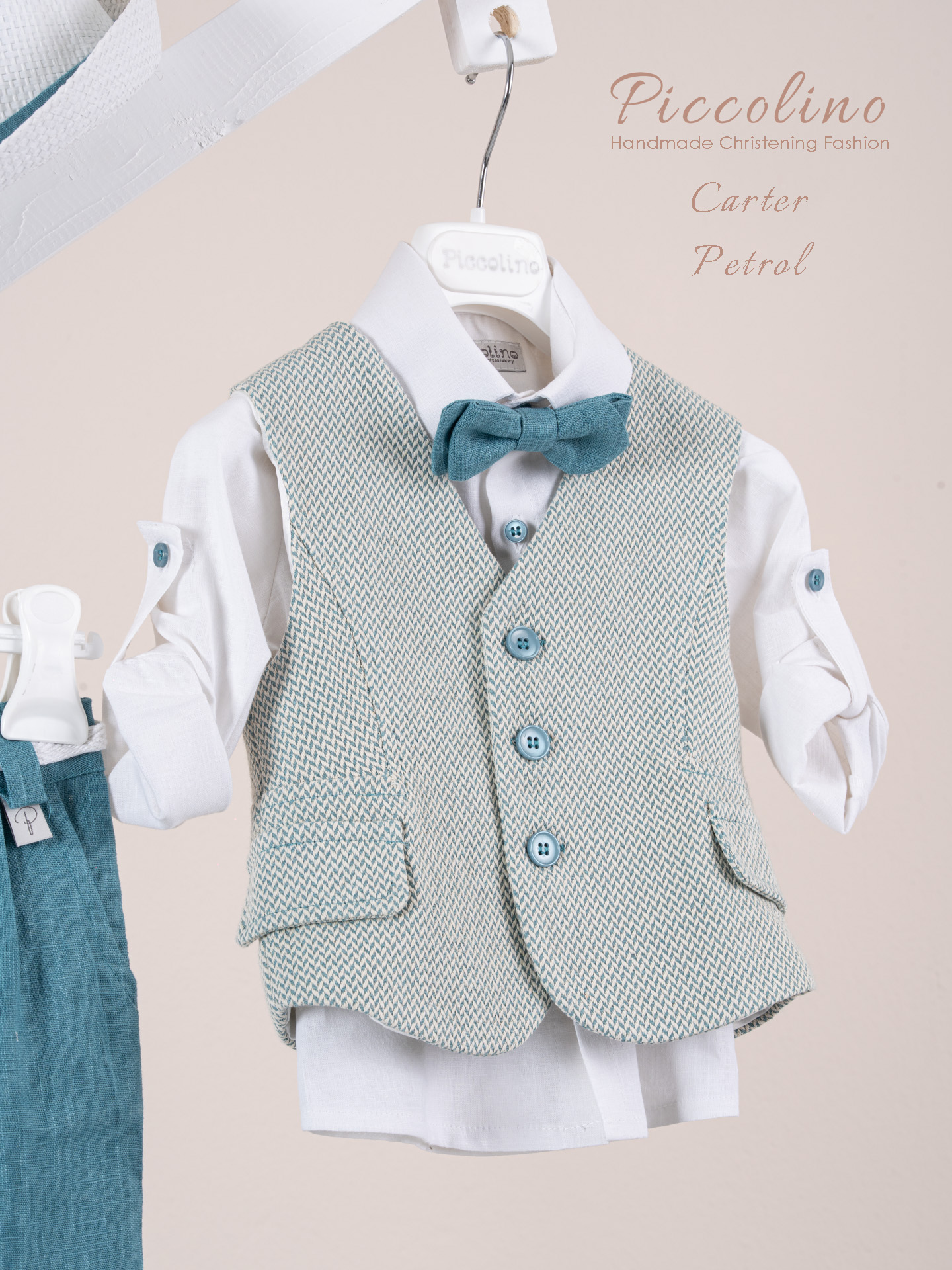 Βαπτιστικό κοστούμι Piccolino Carter σε χρώμα Petrol. Περιλαμβάνει καμπυλόγραμμο γιλέκο , πουκάμισο λινό, παντελόνι λινό με πιέτες σε χρώμα Petrol, παπιγιόν, ζωνάκι με double D δέσιμο και καπέλο με φάσα. Διαθέσιμο σε 4 μεγέθη 6-12, 12-18, 18-24, 24-36(εξτρά χρέωση)