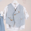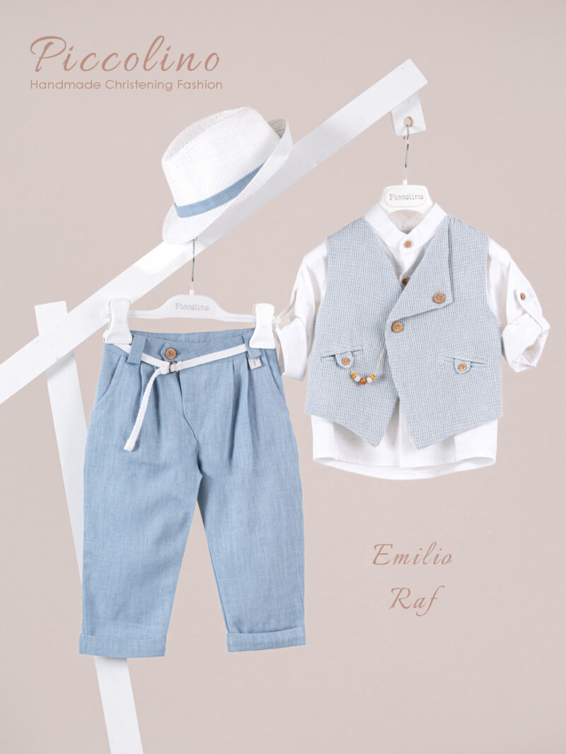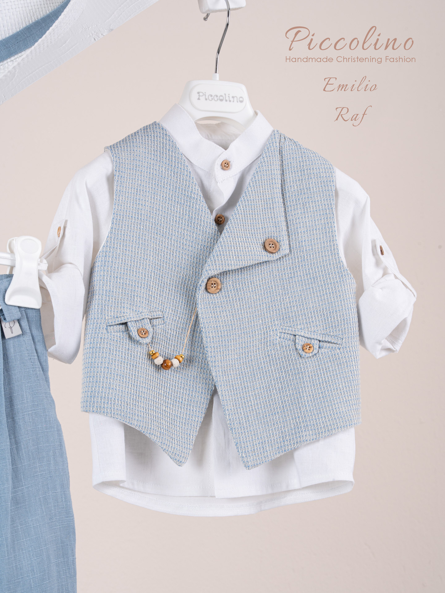 Βαπτιστικό κοστούμι Piccolino Emilio σε χρώμα Raf. Περιλαμβάνει σταυρωτό γιλέκο μονόκουμπο με μύτη ξύλινα κουμπιά και διακοσμητικό κρεμαστό με χάντρες, πουκάμισο λινό με γιακά μαο, παντελόνι λινό σε χρώμα Raf, ζωνάκι με double D δέσιμο και καπέλο με φάσα. Διαθέσιμο σε 4 μεγέθη 6-12, 12-18, 18-24, 24-36(εξτρά χρέωση)