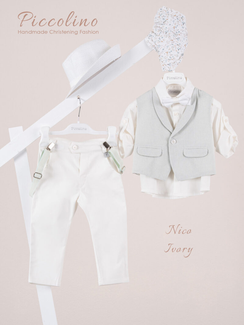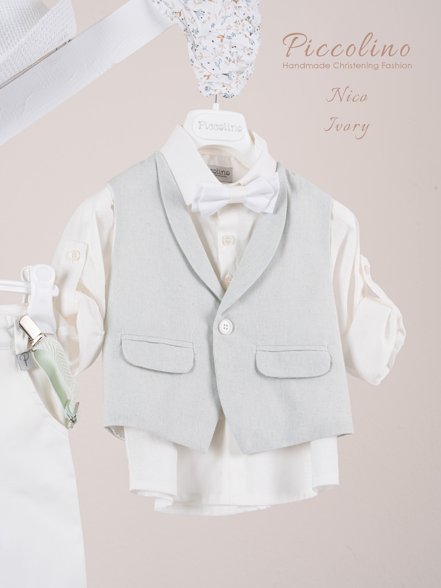 Βαπτιστικό κοστούμι Piccolino Nico σε χρώμα Ivory. Περιλαμβάνει γιλέκο μονόκουμπο με πέτο, πουκάμισο βαμβακερό ιβουάρ, παντελόνι βαμβακερό σε χρώμα Ivory, παπιγιόν, τιράντες και καπέλο με φάσα. Διαθέσιμο σε 4 μεγέθη 6-12, 12-18, 18-24, 24-36(εξτρά χρέωση)