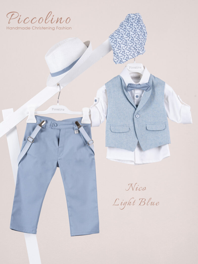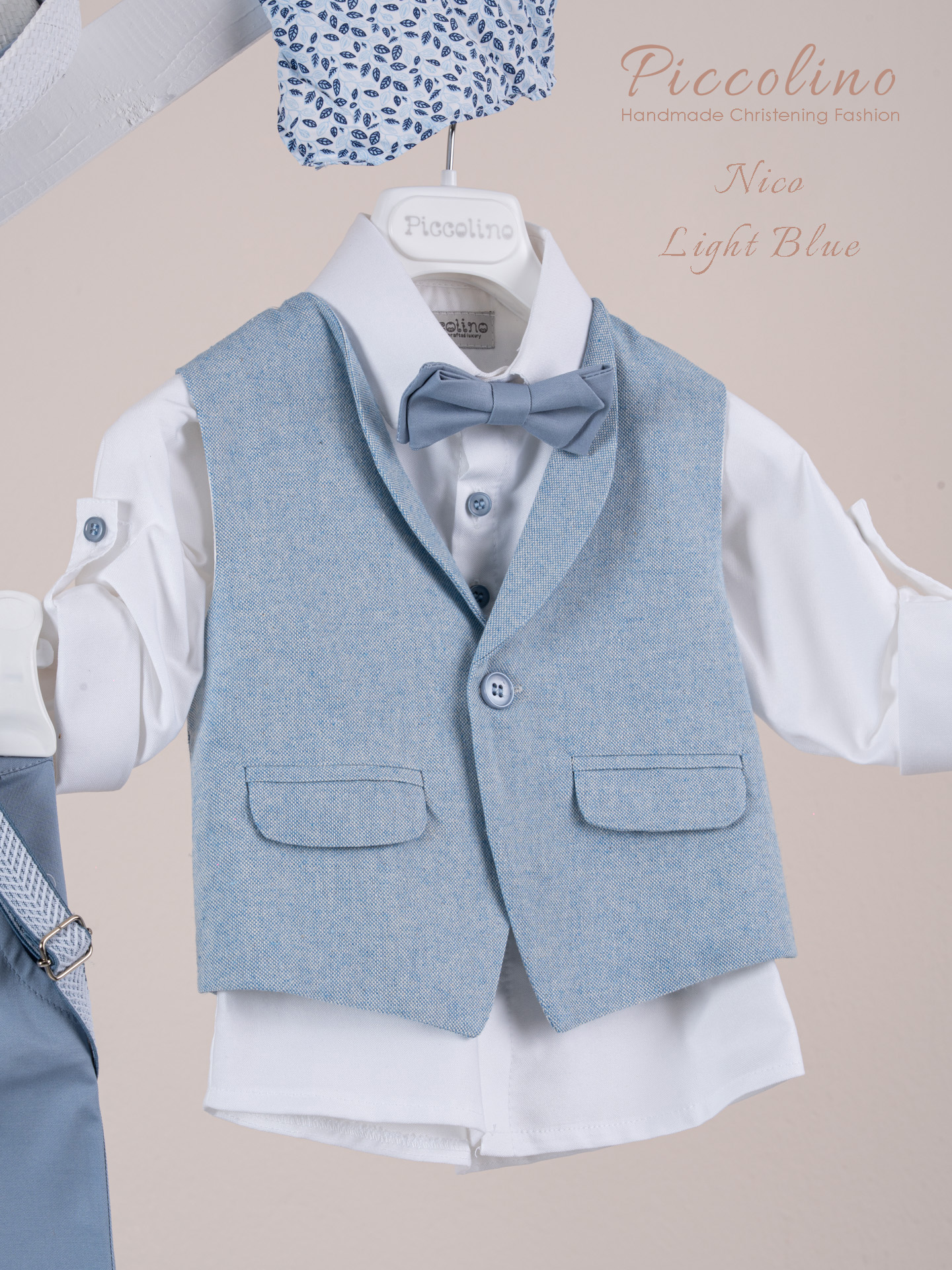 Βαπτιστικό κοστούμι Piccolino Nico σε χρώμα Light Blue. Περιλαμβάνει γιλέκο μονόκουμπο με πέτο, πουκάμισο βαμβακερό λευκό, παντελόνι βαμβακερό σε χρώμα Light Blue, παπιγιόν, τιράντες και καπέλο με φάσα. Διαθέσιμο σε 4 μεγέθη 6-12, 12-18, 18-24, 24-36(εξτρά χρέωση)