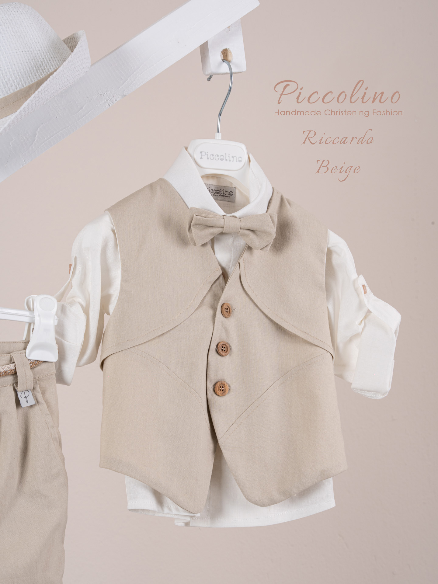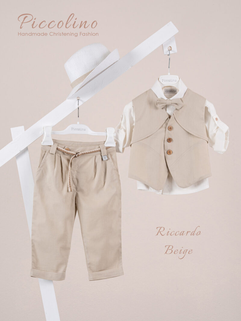 Βαπτιστικό κοστούμι Piccolino Riccardo σε χρώμα Beige. Περιλαμβάνει καμπυλόγραμμο λινό γιλέκο , πουκάμισο λινό, παντελόνι λινό με πιέτες σε χρώμα Beige, παπιγιόν, ζωνάκι με double D δέσιμο και καπέλο με φάσα. Διαθέσιμο σε 4 μεγέθη 6-12, 12-18, 18-24, 24-36(εξτρά χρέωση)