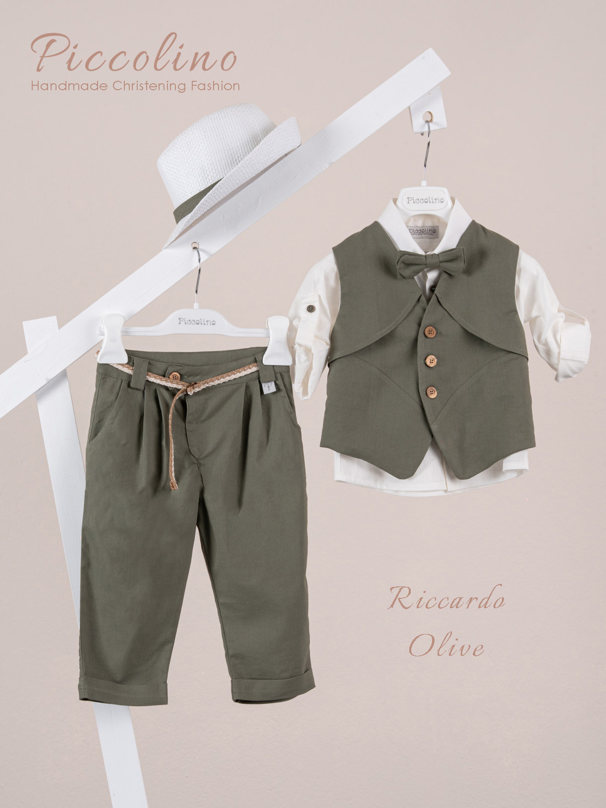 Βαπτιστικό κοστούμι Piccolino Riccardo σε χρώμα Olive. Περιλαμβάνει καμπυλόγραμμο λινό γιλέκο , πουκάμισο λινό, παντελόνι λινό με πιέτες σε χρώμα Olive, παπιγιόν, ζωνάκι με double D δέσιμο και καπέλο με φάσα. Διαθέσιμο σε 4 μεγέθη 6-12, 12-18, 18-24, 24-36(εξτρά χρέωση)