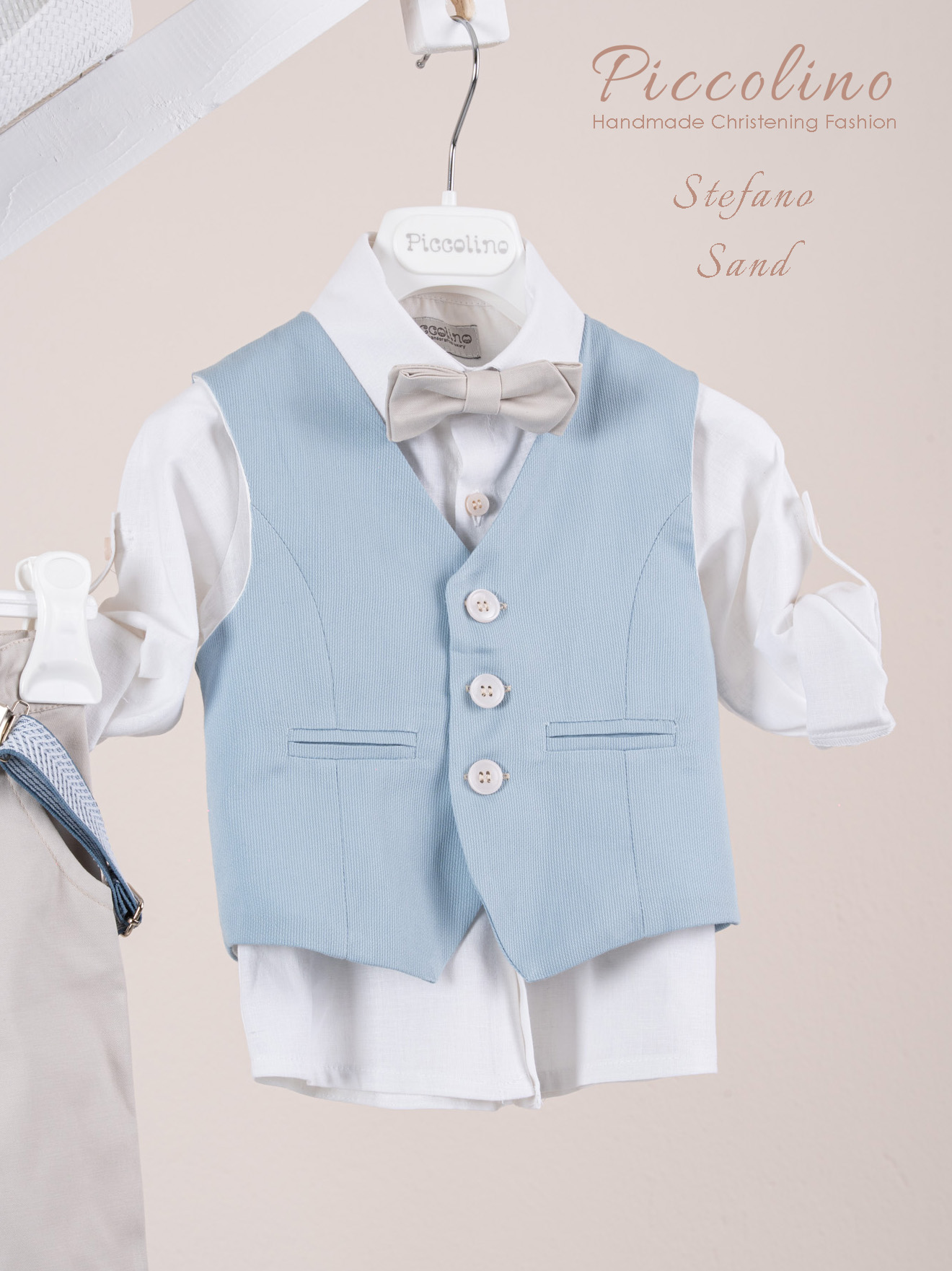 Βαπτιστικό κοστούμι Piccolino Stefano σε χρώμα Sand. Περιλαμβάνει κλασάτο βαμβακερό γιλέκο, πουκάμισο λινό, παντελόνι βαμβακερό σε χρώμα Sand, παπιγιόν, τιράντες και καπέλο με φάσα. Διαθέσιμο σε 4 μεγέθη 6-12, 12-18, 18-24, 24-36(εξτρά χρέωση)