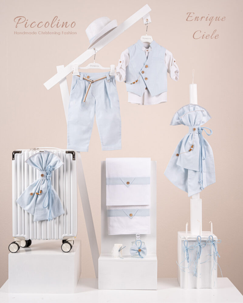 Βαπτιστικό πακέτο Piccolino Enrique ciele περιλαμβάνει κοστούμι ,σετ λαδόπανα, λαμπάδα, λαδοσετ και στολισμένη βαλίτσα white