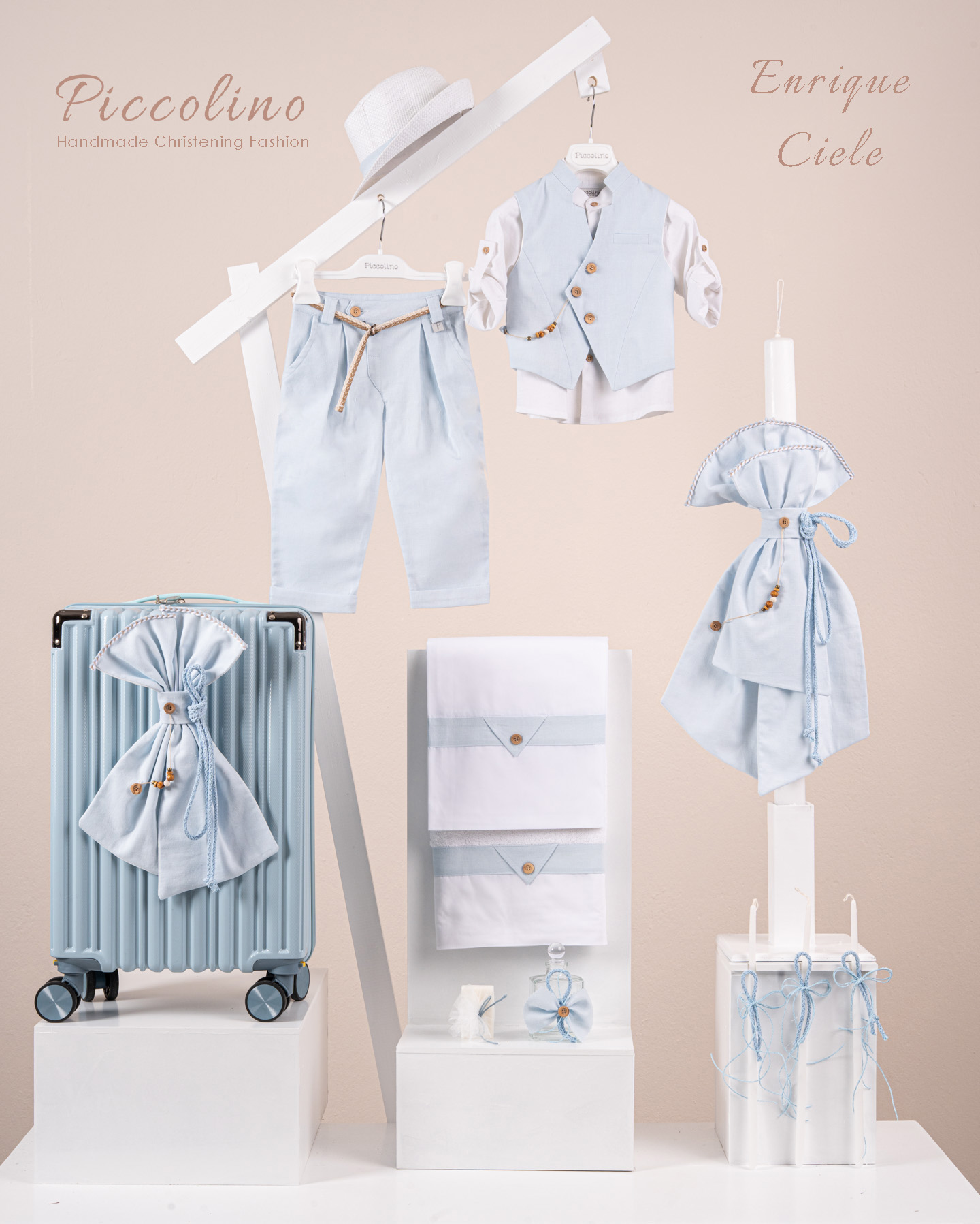 Βαπτιστικό πακέτο Piccolino Enrique ciele περιλαμβάνει κοστούμι ,σετ λαδόπανα, λαμπάδα, λαδοσετ και στολισμένη βαλίτσα light blue