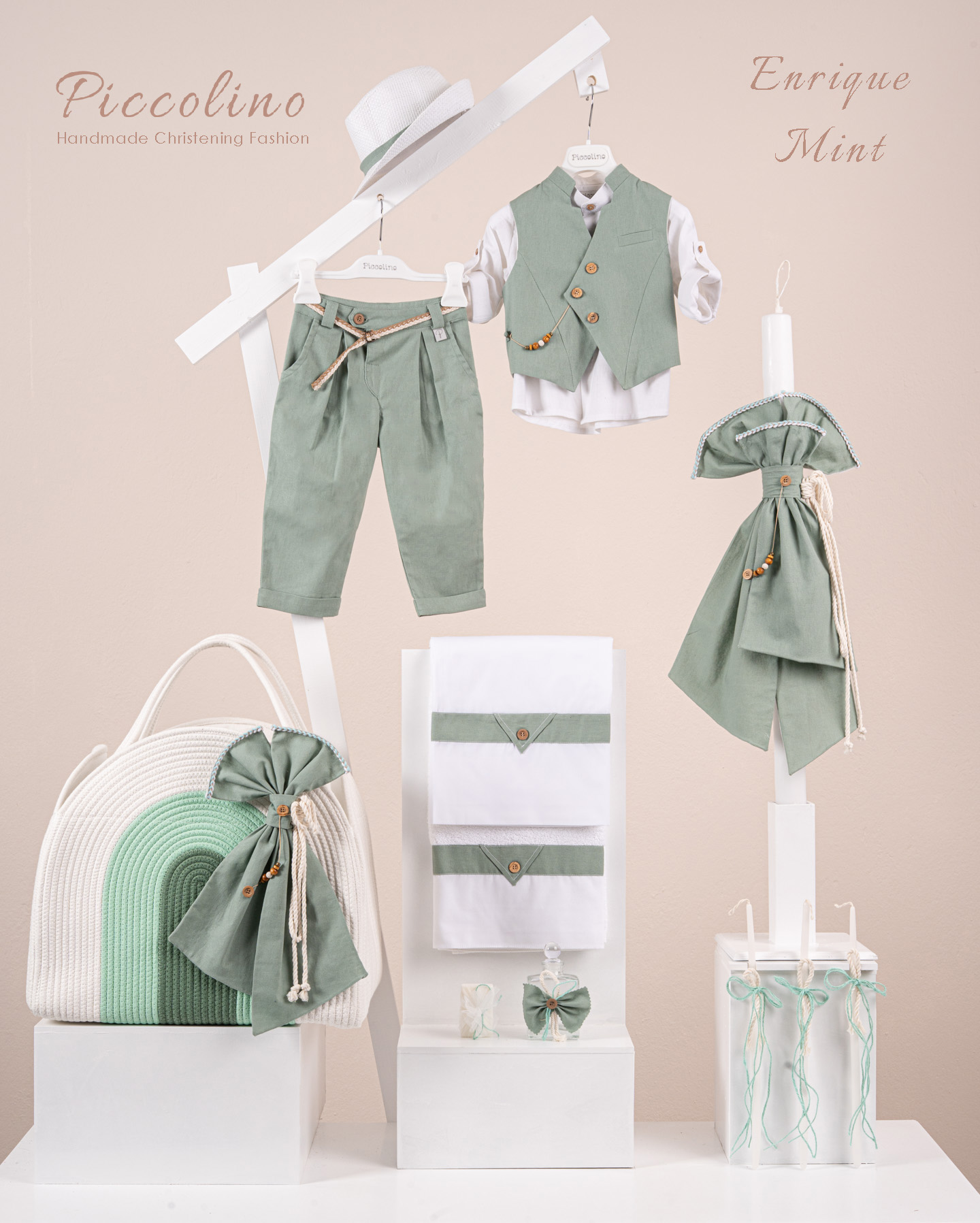 Βαπτιστικό πακέτο Piccolino Enrique mint περιλαμβάνει κοστούμι ,σετ λαδόπανα, λαμπάδα, λαδοσετ και στολισμένη τσάντα ropes