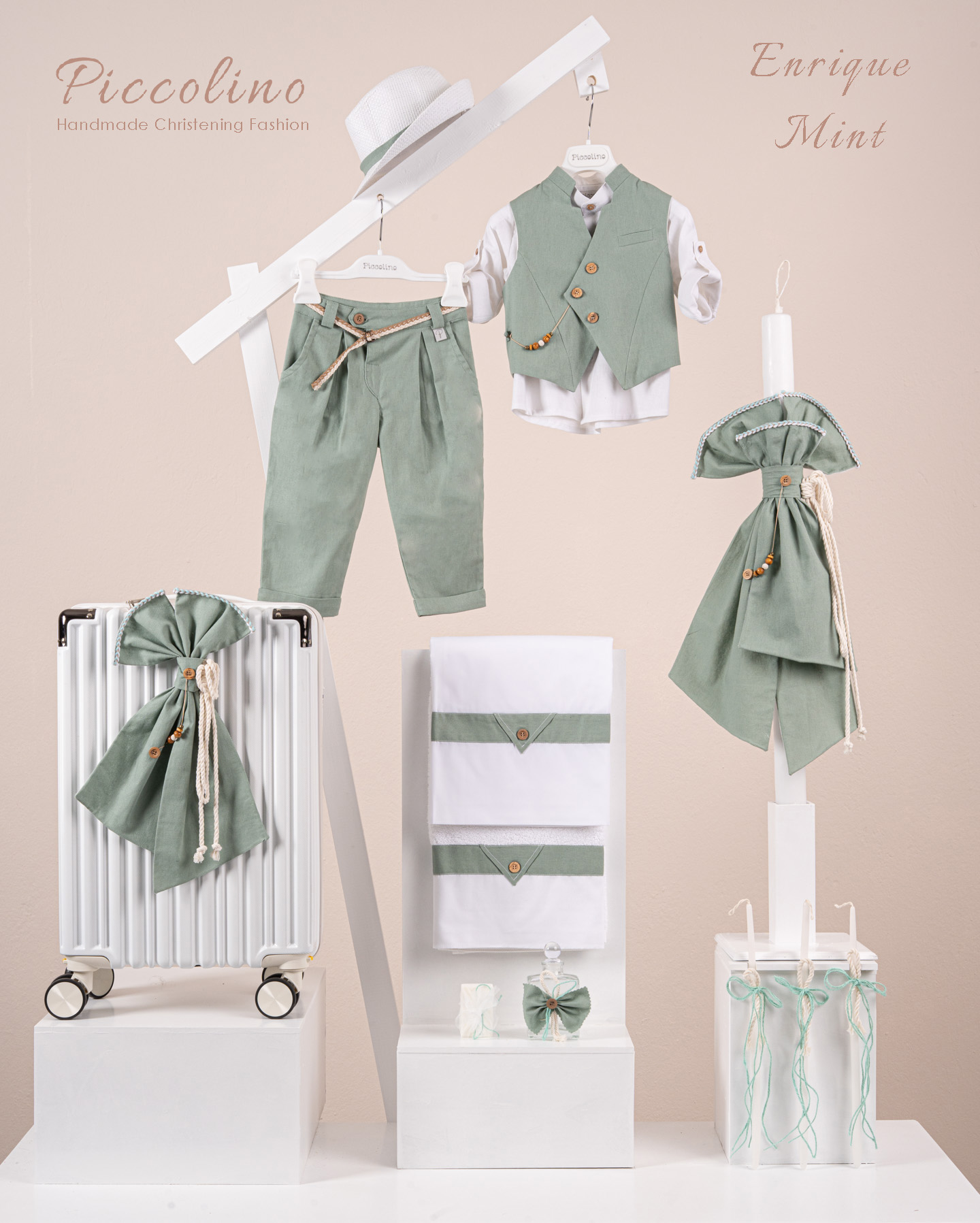 Βαπτιστικό πακέτο Piccolino Enrique mint περιλαμβάνει κοστούμι ,σετ λαδόπανα, λαμπάδα, λαδοσετ και στολισμένη βαλίτσα white