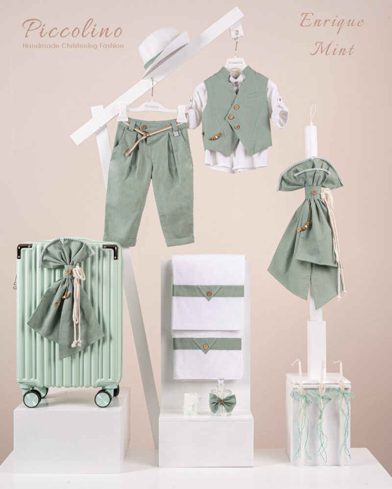 Βαπτιστικό πακέτο Piccolino Enrique mint περιλαμβάνει κοστούμι ,σετ λαδόπανα, λαμπάδα, λαδοσετ και στολισμένη βαλίτσα mint