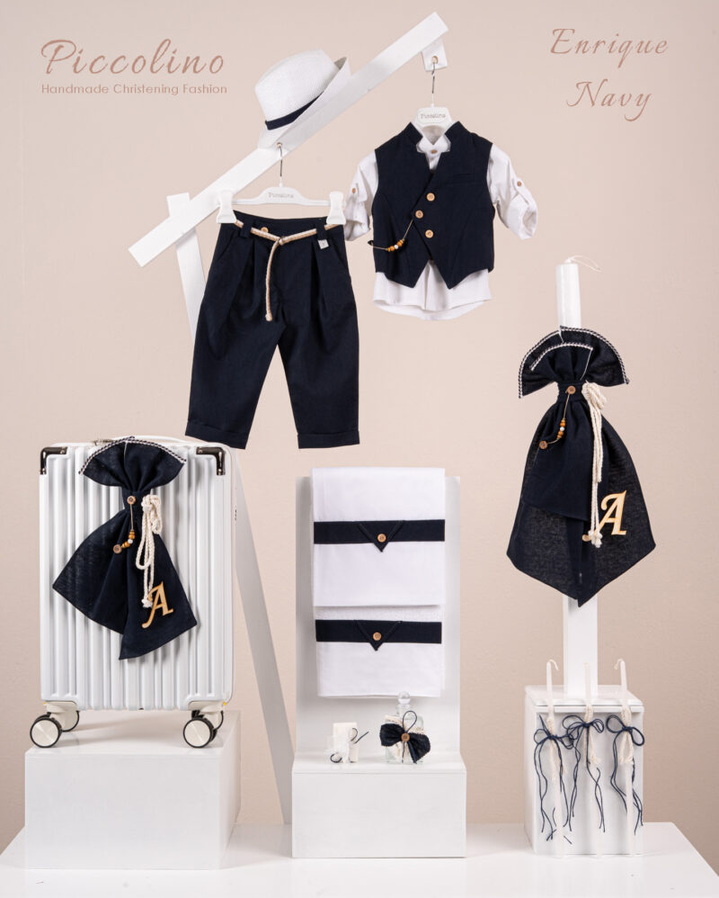 Βαπτιστικό πακέτο Piccolino Enrique navy περιλαμβάνει κοστούμι ,σετ λαδόπανα, λαμπάδα, λαδοσετ και στολισμένη βαλίτσα white