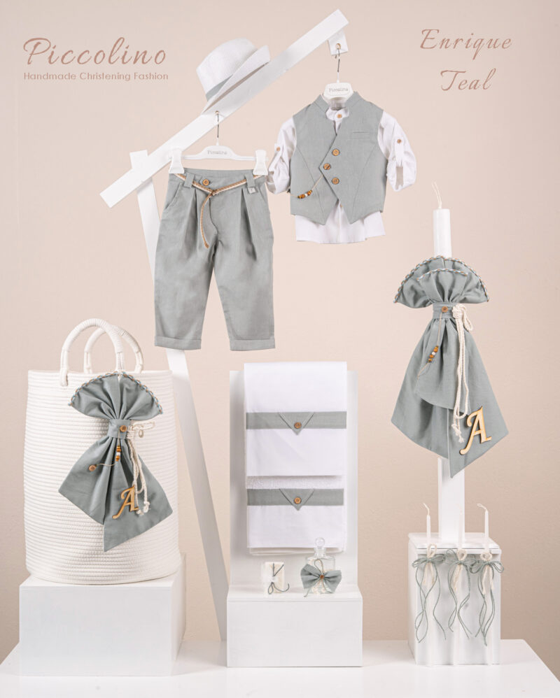 Βαπτιστικό πακέτο Piccolino Enrique teal περιλαμβάνει κοστούμι ,σετ λαδόπανα, λαμπάδα, λαδοσετ και στολισμένο barel off white