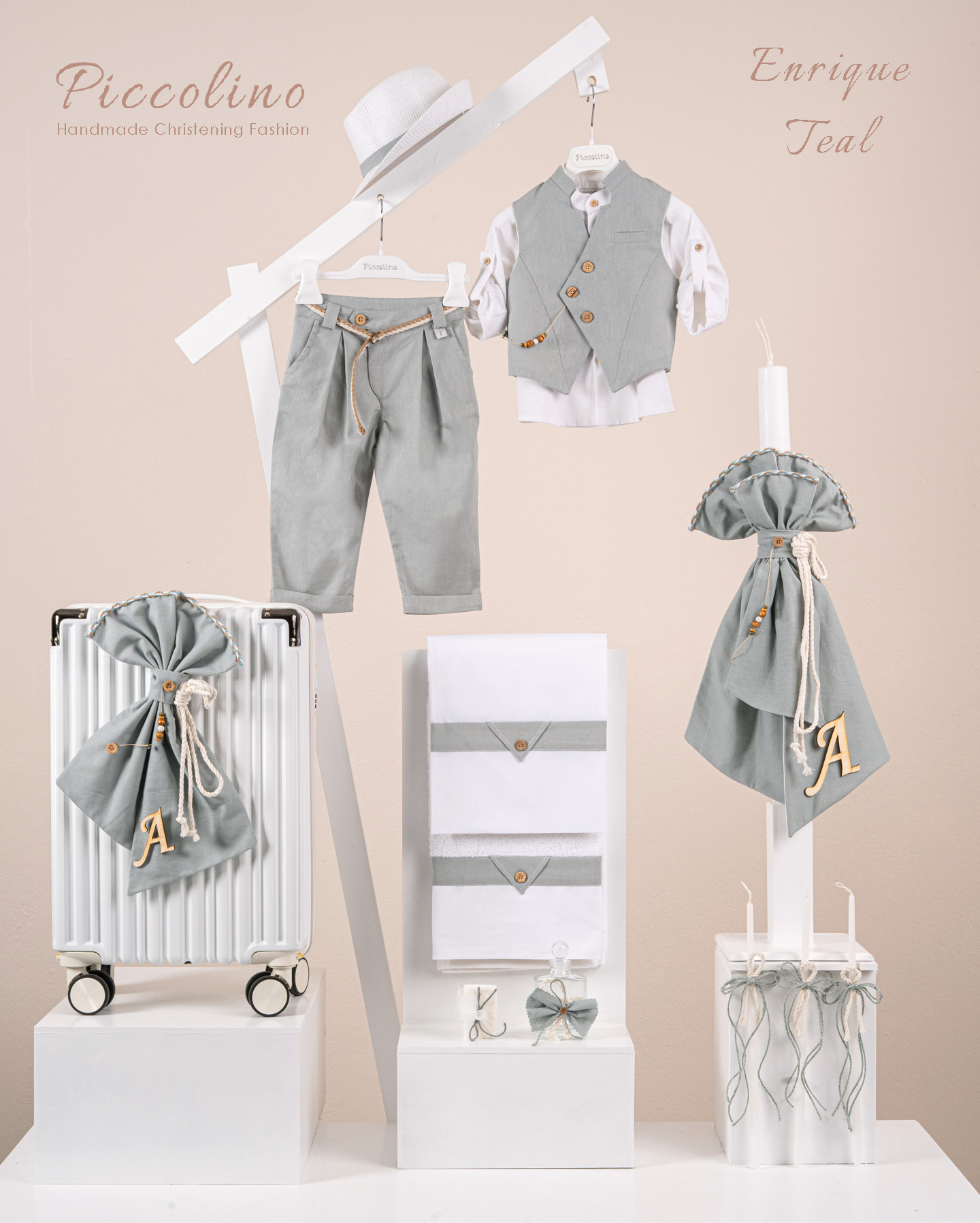 Βαπτιστικό πακέτο Piccolino Enrique teal περιλαμβάνει κοστούμι ,σετ λαδόπανα, λαμπάδα, λαδοσετ και στολισμένη βαλίτσα white