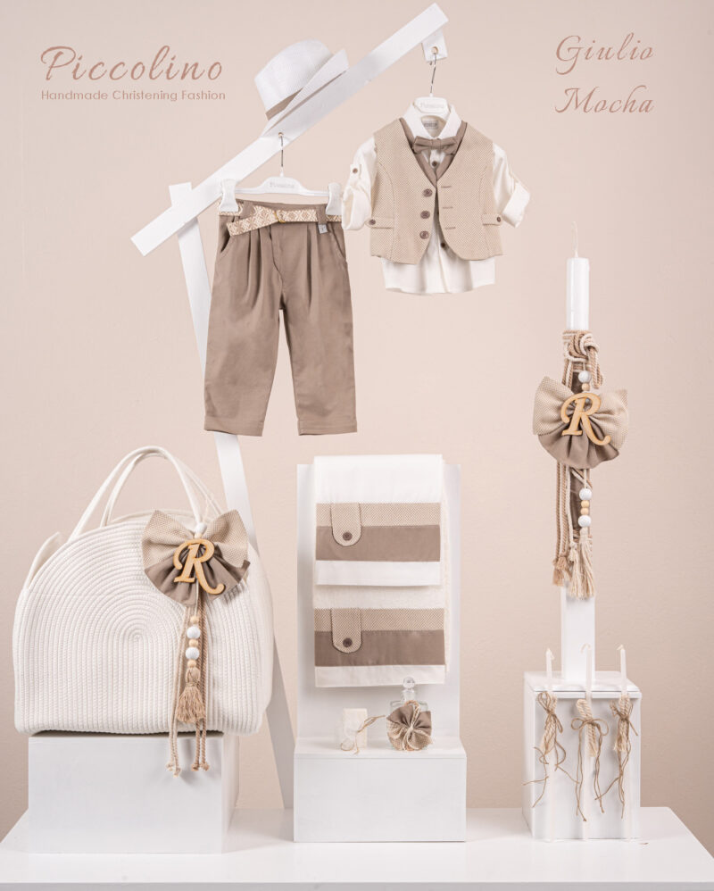 Βαπτιστικό πακέτο Piccolino Giulio mocha περιλαμβάνει κοστούμι ,σετ λαδόπανα, λαμπάδα, λαδοσετ και στολισμένη τσάντα ropes