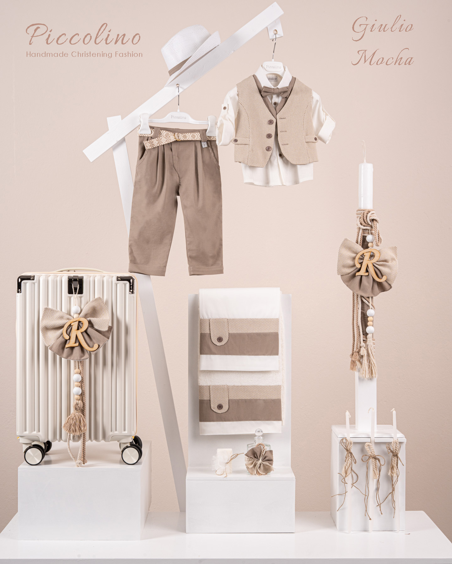 Βαπτιστικό πακέτο Piccolino Giulio mocha περιλαμβάνει κοστούμι ,σετ λαδόπανα, λαμπάδα, λαδοσετ και στολισμένη βαλίτσα cream