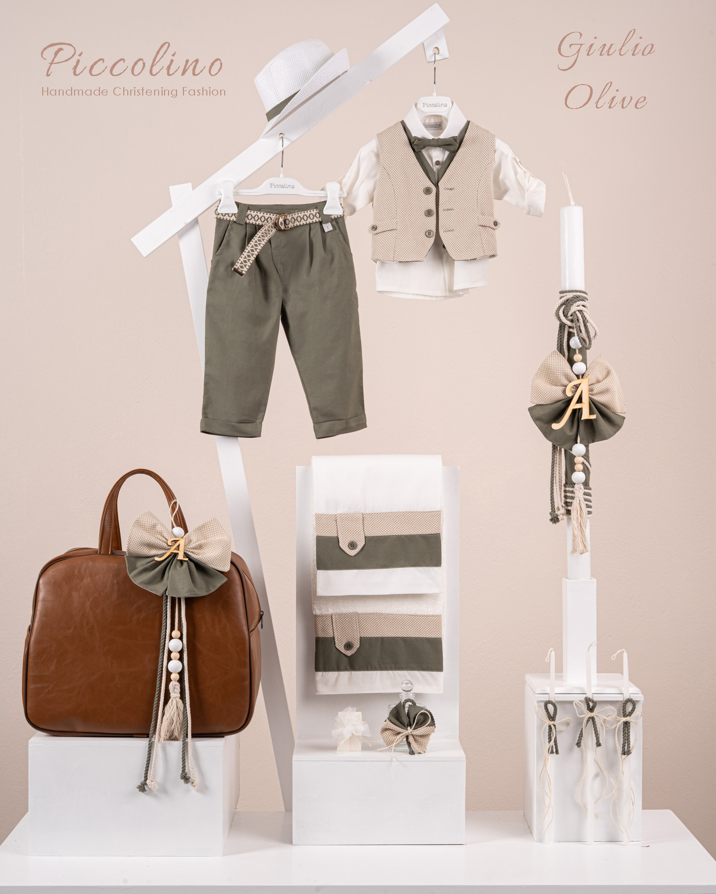 Βαπτιστικό πακέτο Piccolino Giulio olive περιλαμβάνει κοστούμι ,σετ λαδόπανα, λαμπάδα, λαδοσετ και στολισμένη τσάντα καφέ