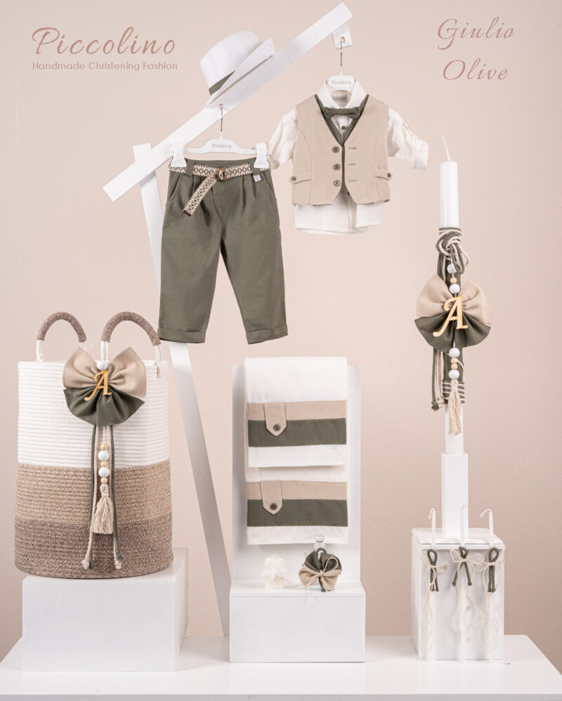Βαπτιστικό πακέτο Piccolino Giulio olive περιλαμβάνει κοστούμι ,σετ λαδόπανα, λαμπάδα, λαδοσετ και στολισμένο barel beige