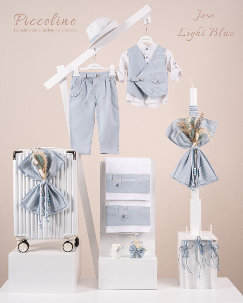 Βαπτιστικό πακέτο Piccolino Jose light blue περιλαμβάνει κοστούμι ,σετ λαδόπανα, λαμπάδα, λαδοσετ και στολισμένη βαλίτσα white