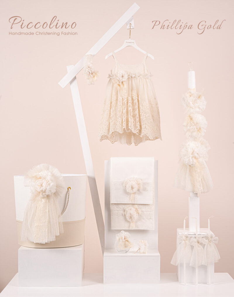 Βαπτιστικό πακέτο Piccolino Phillopa gold περιλαμβάνει φόρεμα ,σετ λαδόπανα, λαμπάδα, λαδοσετ και στολισμένo καλάθι δερμάτινο