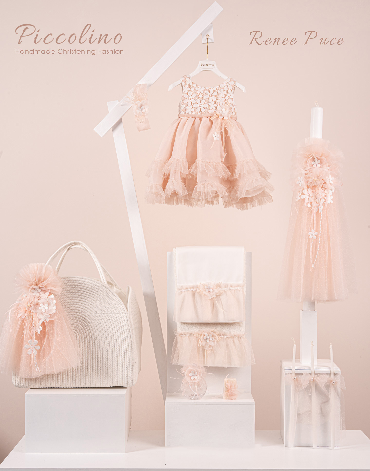 Βαπτιστικό πακέτο Piccolino Renee puce περιλαμβάνει φόρεμα ,σετ λαδόπανα, λαμπάδα, λαδοσετ και στολισμένη τσάντα ropes