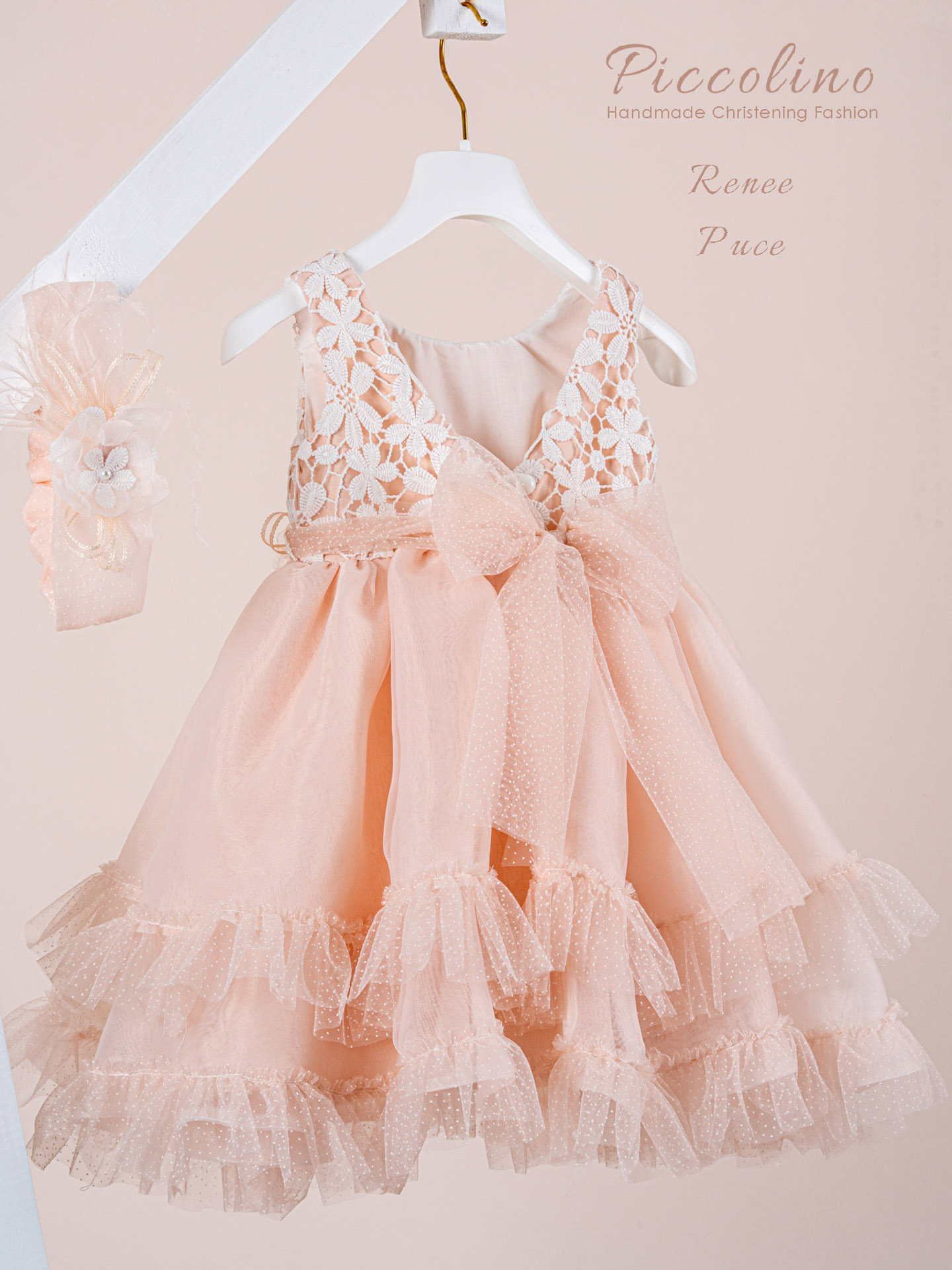 Βαπτιστικό πακέτο Piccolino Renee puce περιλαμβάνει φόρεμα ,σετ λαδόπανα, λαμπάδα, λαδοσετ και στολισμένη τσάντα καπιτονέ