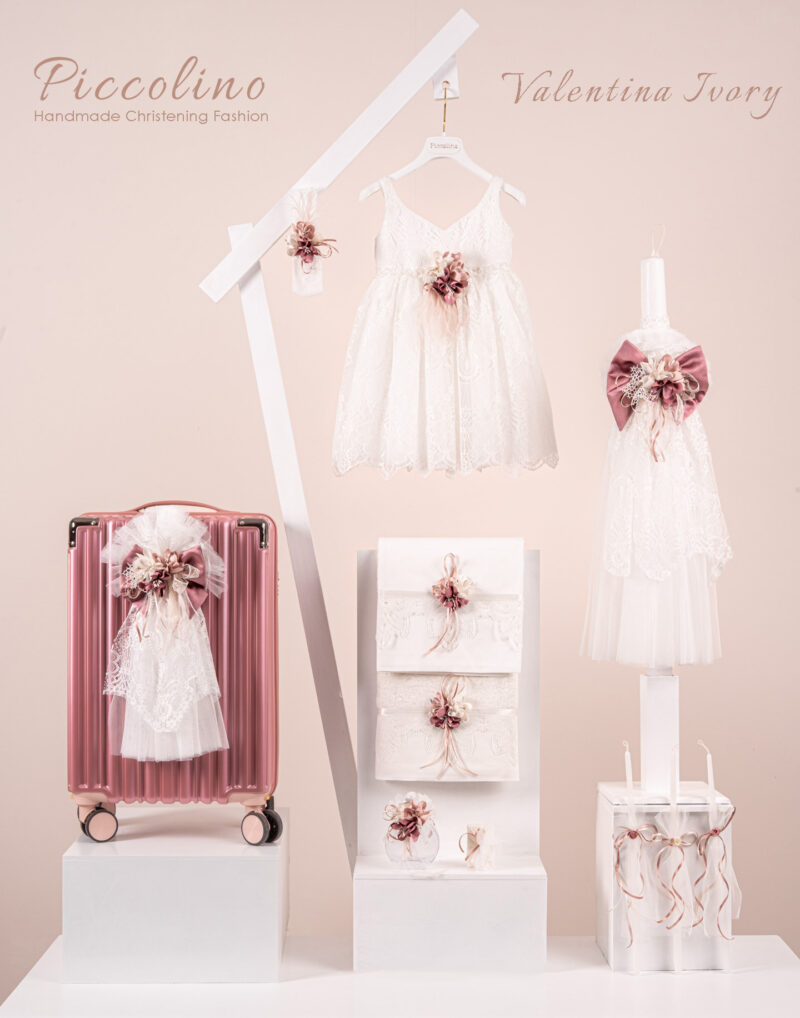 Βαπτιστικό πακέτο Piccolino Valentina ivory περιλαμβάνει φόρεμα ,σετ λαδόπανα, λαμπάδα, λαδοσετ και στολισμένη βαλίτσα puce