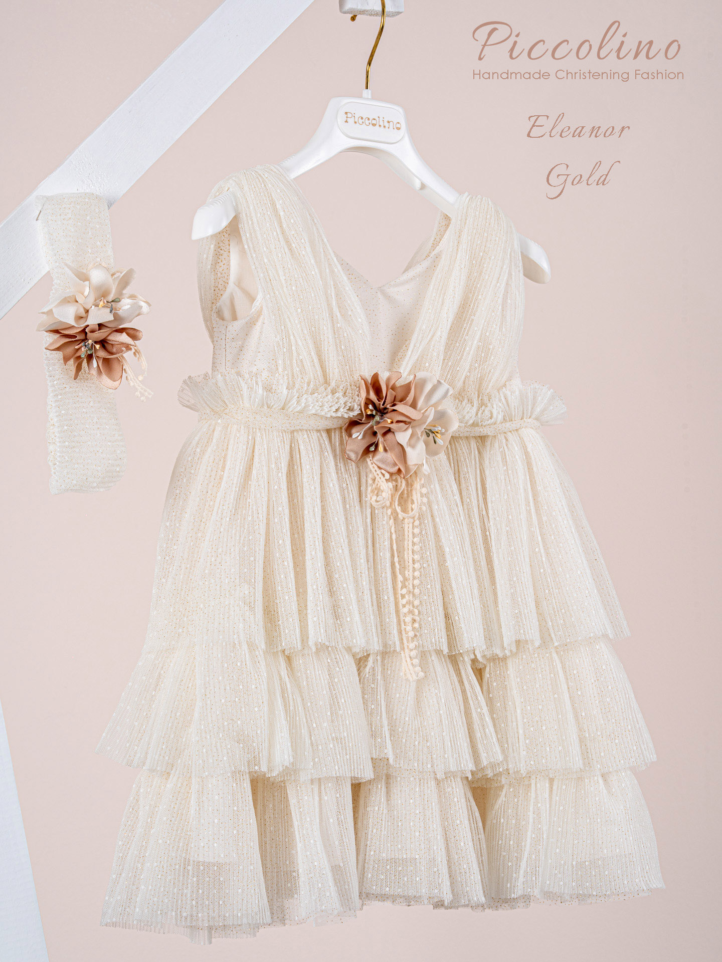 Βαπτιστικό φόρεμα Piccolino Eleanor Gold. Εντυπωσιάκο φόρεμα, με μπούστο από γκλίτερ με λαιμόκοψη σε σχήμα καρδιάς, σχέδιο από πλισέ τούλι που ξεκινά από τους ώμους και καταλήγει στη μέση και με μία πλόυσια φούστα τριών επιπέδων από τούλι με γκλίτερ και πλισέ τούλι. Το ντεκόρ του φορέματος αποτελείται από δύο εντυπωσιάκα χειροποίητα λουλούδια. Το φόρεμα συνοδέυεται απο κορδέλα με ντεκόρ όμοιο με το φόρεμα. Διαθέσιμο σε 4 μεγέθη: 6-12, 12-18, 18-24, 24-36(εξτρά χρέωση).
