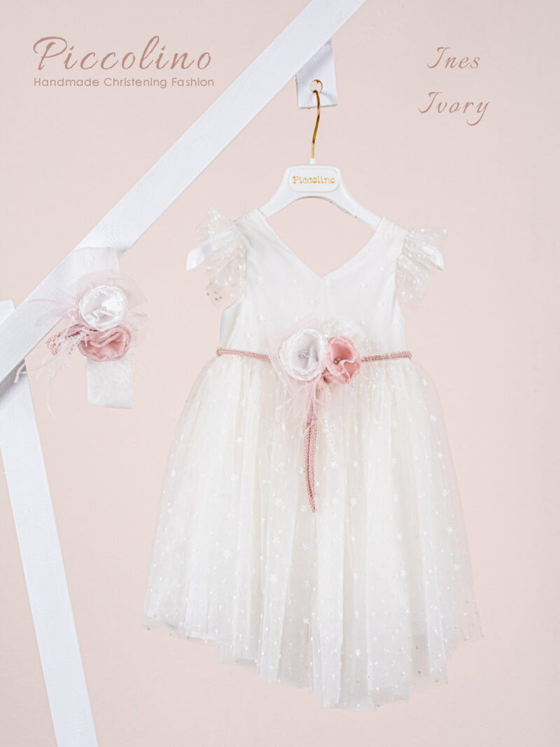 Βαπτιστικό φόρεμα Piccolino Ines Ivory. Ρομαντικό φόρεμα από δαντέλα, με ασσύμετρη φούστα και με μανικάκι από πουά τούλι. Το ντεκόρ του φορέματος αποτελείται από ζωνάκι ρε ροζ απόχρωση και σύνθεση με χειροποίητα λουλούδια. Το φόρεμα συνοδέυεται απο κορδέλα με ντεκόρ όμοιο με το φόρεμα. Διαθέσιμο σε 4 μεγέθη: 6-12, 12-18, 18-24, 24-36(εξτρά χρέωση).