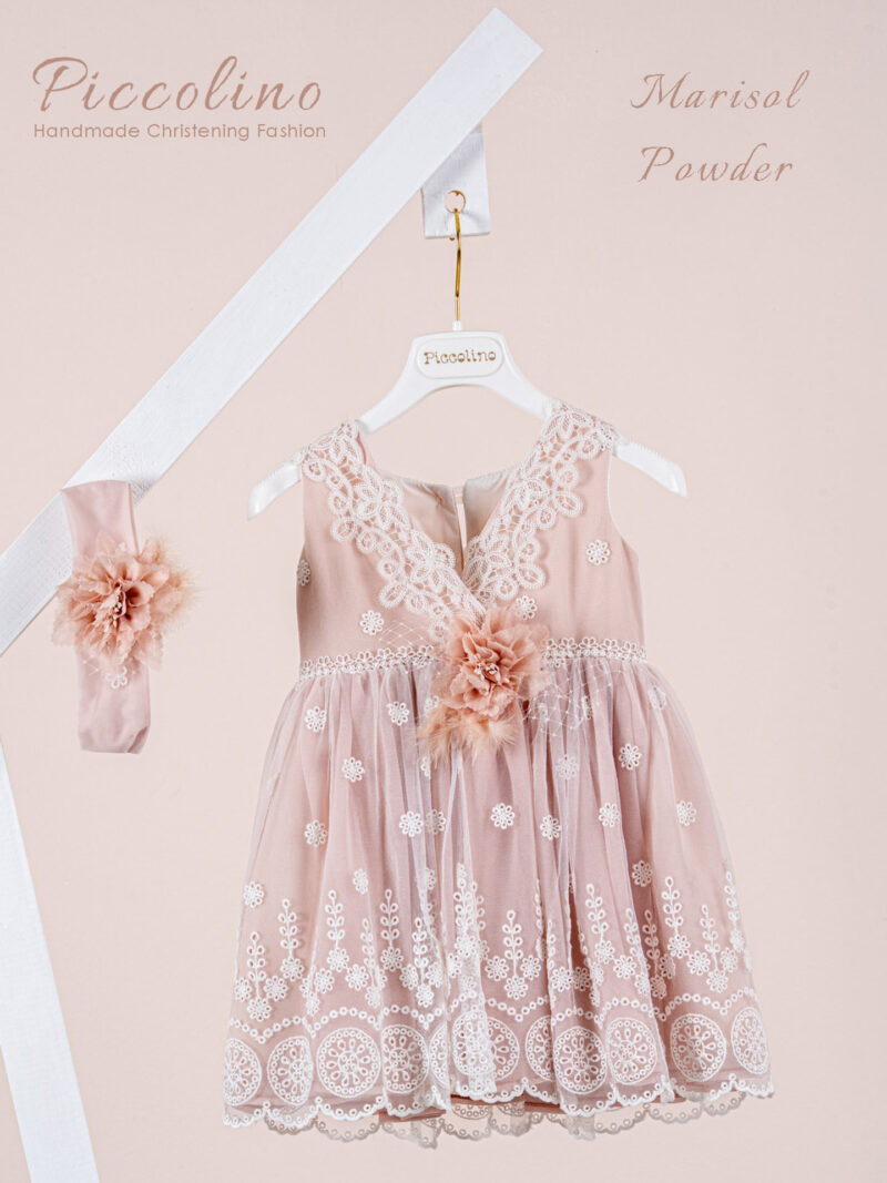 Βαπτιστικό φόρεμα Piccolino Marisol Powder. Ρομαντικό βαπτιστικό φόρεμα από δαντέλα με μικρές μαργαριτούλες. Στο μπούστο του φορέματος σχηματίζεται λαιμόκοψη σε σχήμα V από δαντελένια τρέσσα. Το ντεκόρ του φορέματος αποτελείται από δαντελένιο ζωνάκι, χειροποίητο λουλούδι και πούπουλα. Το φόρεμα συνοδέυεται απο κορδέλα με ντεκόρ όμοιο με το φόρεμα. Διαθέσιμο σε 4 μεγέθη: 6-12, 12-18, 18-24, 24-36(εξτρά χρέωση).