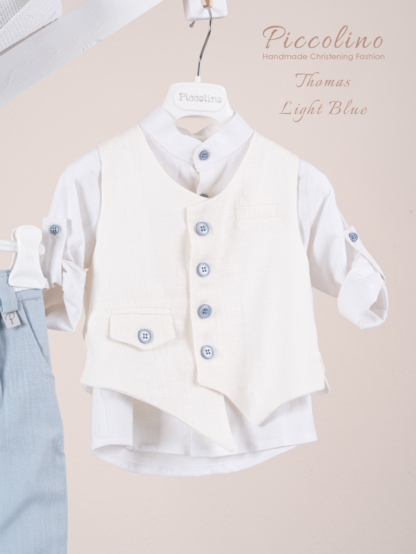 Βαπτιστικό κοστούμι 7 τεμαχίων Piccolino Thomas σε χρώμα Light Blue. Περιλαμβάνει λινό γιλέκο λοξό με μύτες, πουκάμισο με γιακά μαο λινό, παντελόνι με πιέτες λινό σε χρώμα ciele, φουλάρι, ζώνη και καπέλο με φάσα. Διαθέσιμο σε 4 μεγέθη 6-12, 12-18, 18-24, 24-36(εξτρά χρέωση)
